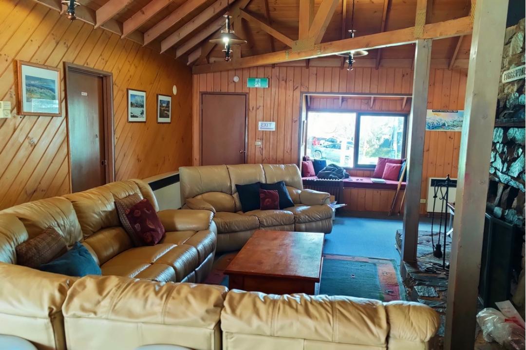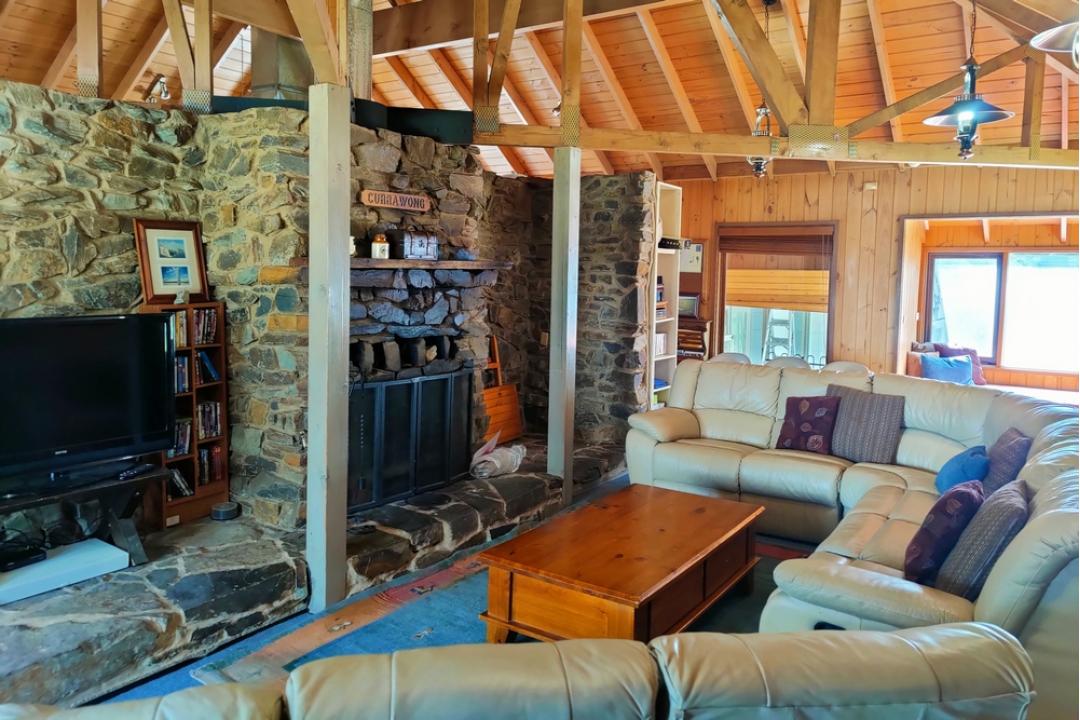 Currawong is a spacious lodge with a lounge area featuring a large open fireplace and comfortable couches for a cosy friendly feel.