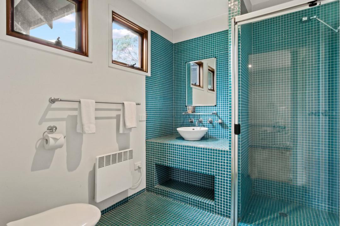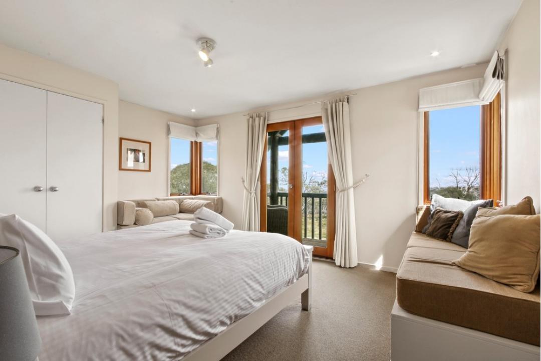 This show case house is loaded with fine appointments and a tiled spa pool. The great open plan living area is heated by an open fireplace, and the rear deck overlooks the reserve. This property is always in demand. There is a bathroom, drying room and laundry off the entry foyer and hall, as well as the stairs to the upper level. The spacious open plan living, dining, kitchen area is on the ground floor, with large decks on both sides of the living area. A comfortable sofa, lounge chairs and window seats provide plenty of seating for the whole group. There is a large dining table and a fully equipped and spacious kitchen, all heated by a wood fired heater.