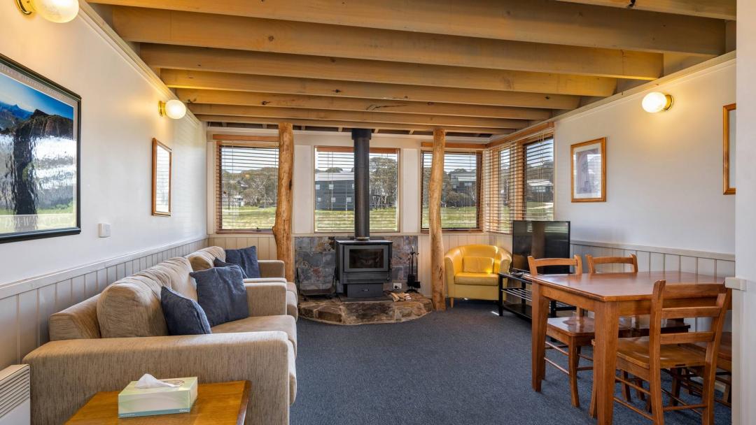 Tucked away in the heart of Dinner Plain, this charming alpine retreat captures the warmth and character of one of the area's original properties. A slow-combustion fireplace set against a rustic stone hearth creates the perfect cozy atmosphere, while the private balcony offers a peaceful spot to soak in views of the nearby Alpine National Park.